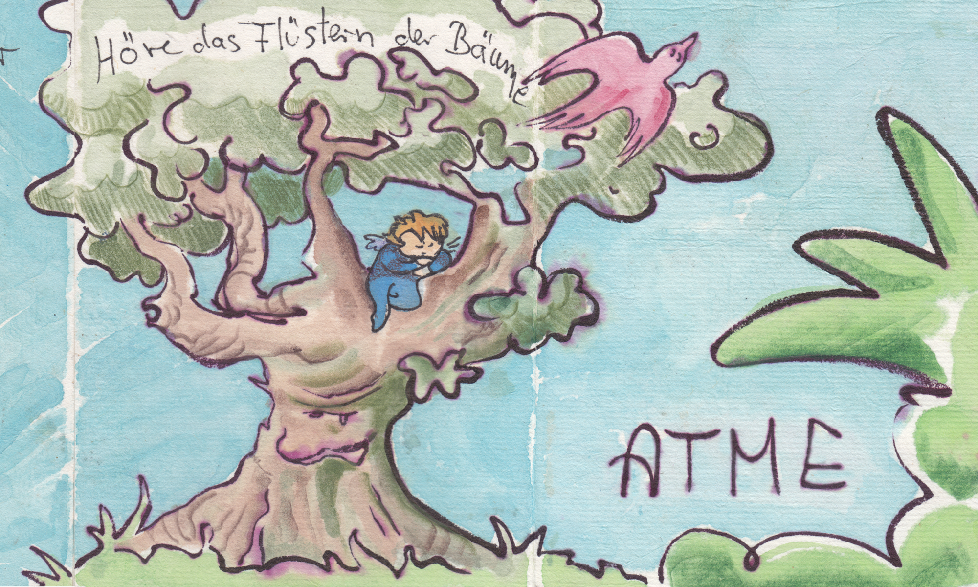 Zur Optik der Illustration sei gesagt, dass ich das Original auf ein blanko Leporellobuch aquarelliert habe. Das partielle Verschwimmen der Outline entstand aus dem beidseitigen Farbauftrag. Die Anmutung des Aquarells soll in der Endfassung erhalten bleiben; das „Auslaufen“ der Linie werde ich abmildern.